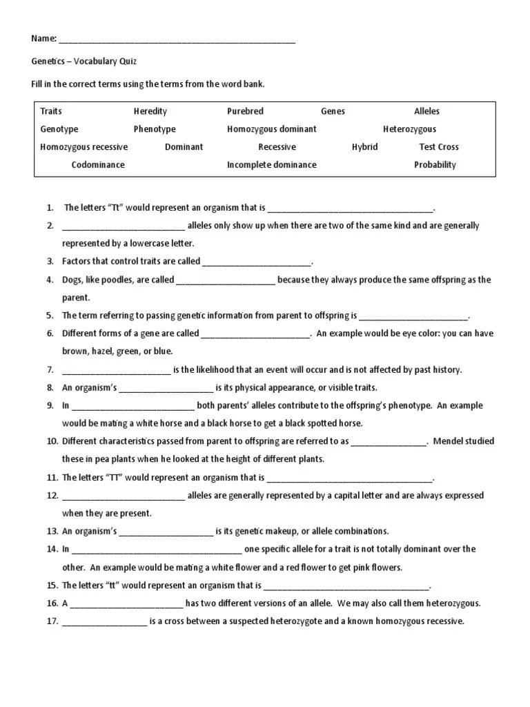 Scientists call the factors that control traits.genes. Print answer key pdf take now . The other genetic factor for each trait comes from a. Building vocabulary from tall parent. Genetics vocabulary worksheet chapter 5.